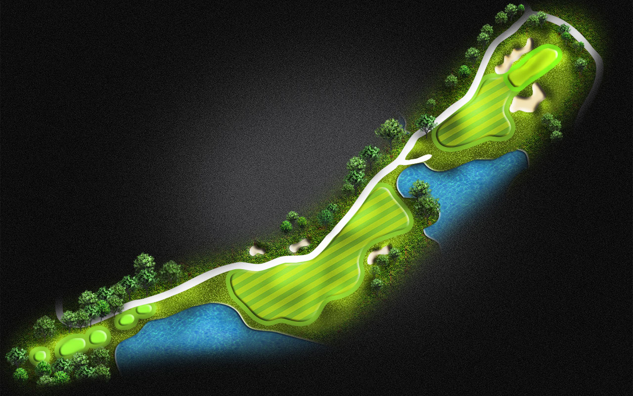 A demanding tee shot on the Par 5 is crucial. You must lay up between the water on the right and left. Long hitters will have a chance to get to the green in 2.